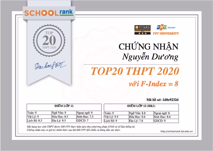 Sau khi tra cứu kết quả xếp hạng, học sinh trong TOP50 sẽ nhận được giấy chứng nhận cấp bởi Đại học FPT qua email. Mỗi giấy chứng nhận gửi về email của học sinh được kèm theo một mã hồ sơ. Tuy nhiên, giấy chứng nhận chỉ có giá trị thực khi học sinh gửi bản sao công chứng học bạ về trường FPT cùng mã hồ sơ để trường xác nhận tính hợp lệ của chứng nhận.