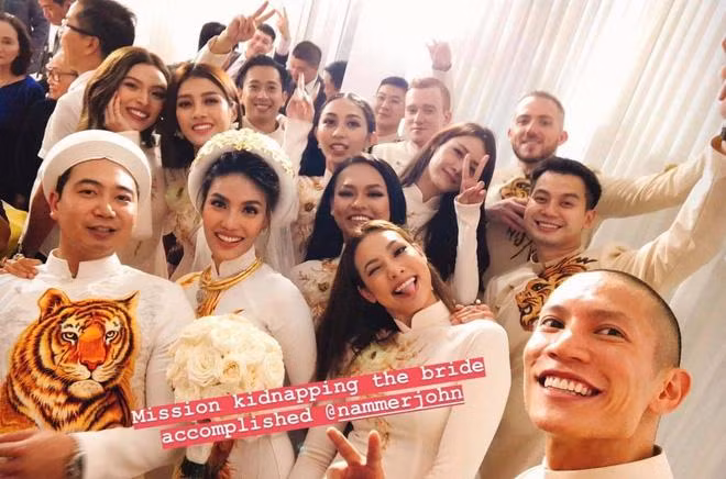 Dàn người đẹp có mặt trong đội hình đỡ tráp cũng đều là những gương mặt quen thuộc của cuộc thi "The Face" mà Lan Khuê đảm nhận vai trò Huấn luyện viên như: Mai Ngô, Thu Hiền, Kim Chi, Lilly Nguyễn... Khung cảnh buổi lễ đính hôn của Lan Khuê cùng bạn trai được trang trí đơn giản nhưng vô cùng tinh tế với tông chủ đạo màu đỏ.