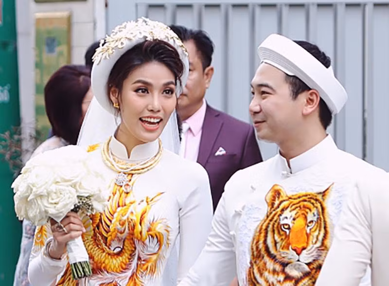 Theo đó, buổi lễ đính hôn của Lan Khuê và bạn trai - doanh nhân Tuấn John được tổ chức vào sáng nay 24-9 tại nhà riêng của Lan Khuê ở TP.HCM. Cả hai chọn mặc trang phục áo dài truyền thống và đội mấn cùng tông màu trắng. Phần ngực trên áo dài của cặp đôi được thêu họa tiết khá đặc biệt: hình rồng trên áo cô dâu và hình hổ trên áo chú rể.