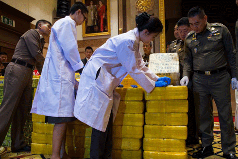 Cảnh sát trưởng Quốc gia Thái Lan Chaktip Chaijinda (thứ hai từ phải sang) cùng các chuyên gia kiểm nghiệm số ma túy đá gồm 10 triệu viên yaba được sản xuất ở Myanmar bị thu giữ ở Thủ đô Bangkok ngày 11-5-2018