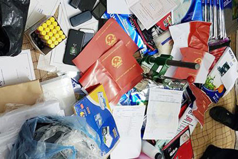 Các đối tượng làm giả văn bằng, chứng chỉ và tang vật bị CATP Hà Nội bắt giữ