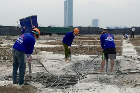 Công nhân Công ty Cổ phần Tập đoàn Phương Bắc dùng máy khoan phá dỡ phần trần bê tông.