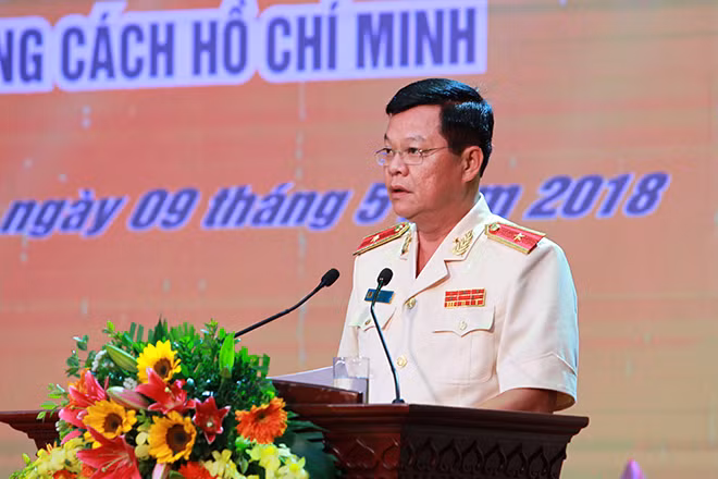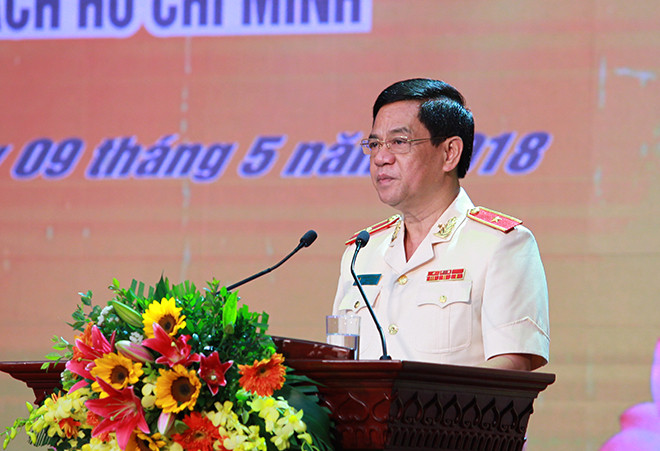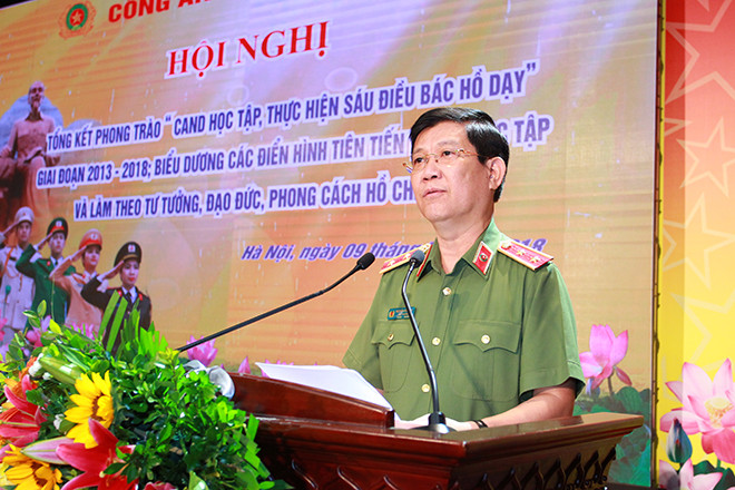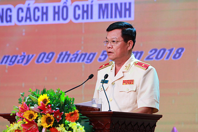 Thiếu tướng Đào Thanh Hải trình bày báo cáo tổng kết 5 năm thực hiện phong trào “CAND học tập, thực hiện sáu điều Bác Hồ dạy” giai đoạn 2013-2018