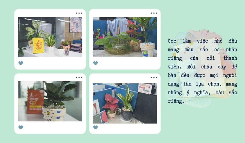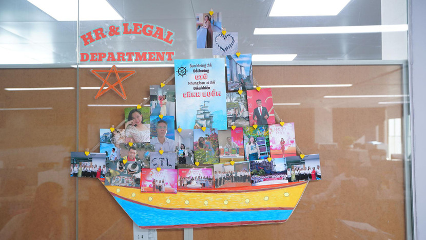 Hướng đến tiêu chí “Xanh – Sạch – Đẹp”, Ban Nhân sự và Phòng Pháp Chế đã điểm xanh bàn làm việc của từng thành viên bằng một chậu cây và bảng tên nhỏ xinh. Mỗi chậu cây để bàn được lựa chọn kỹ, mang những ý nghĩa, màu sắc riêng. Điểm nhấn nổi bật trong không gian xanh của Ban Nhân sự và Phòng Pháp Chế là Khung ảnh kỷ niệm hình con thuyền.