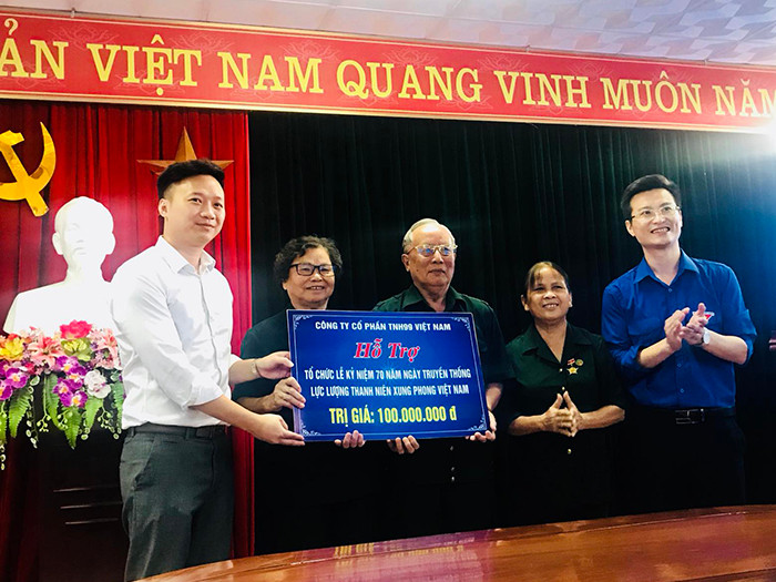 Đại diện Công ty cổ phần TNH99 Việt Nam trao 100.000.000 đồng hỗ trợ tổ chức Lễ kỷ niệm 70 năm ngày Truyền thống lực lượng Thanh niên xung phong Việt Nam