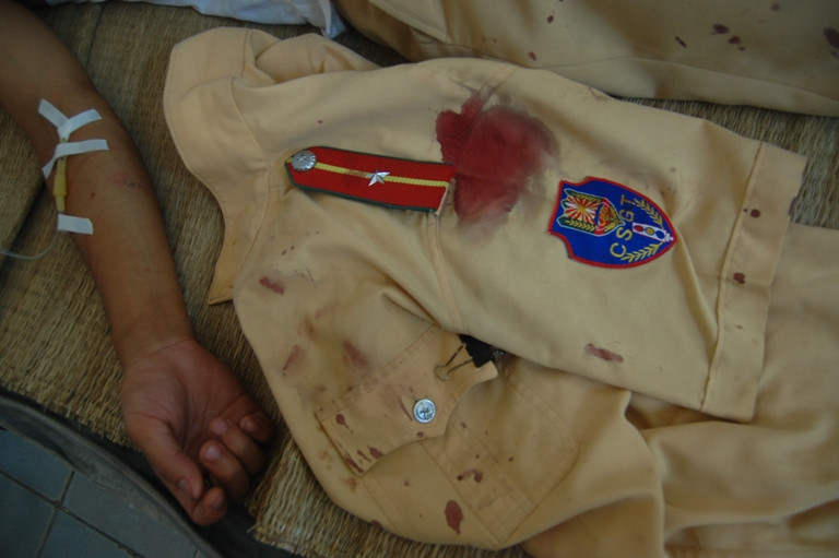 Vết chém đúng vào phần bả vai trái, máu vẫn còn thấm đỏ cả màu áo người CSGT
