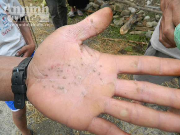 Bàn tay một người dân bị rộp, nổi mụn ngứa nghi bị ảnh hưởng bởi thuốc diệt cỏ