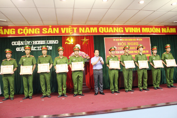 Ông Trần Thế Cương, Phó Bí thư Quận ủy, Chủ tịch UBND quận Bắc Từ Liêm trao Giấy khen của Chủ tịch UBND quận cho các tập thể và cá nhân có thành tích xuất sắc trong điều tra khám phá án