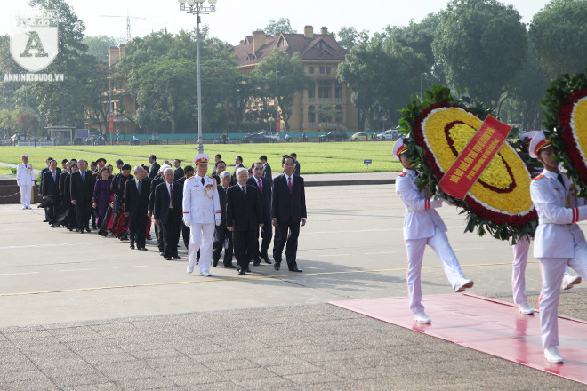 Đoàn đại biểu Ban Chấp hành Trung ương Đảng, Chủ tịch nước, Quốc hội, Chính phủ, Ủy ban Trung ương Mặt trận Tổ quốc Việt Nam vào Lăng viếng Chủ tịch Hồ Chí Minh có các đồng chí: Tổng Bí thư Nguyễn Phú Trọng, nguyên Tổng Bí thư Lê Khả Phiêu, Nông Đức Mạnh; Chủ tịch nước Trần Đại Quang; Thủ tướng Chính phủ Nguyễn Xuân Phúc; Chủ tịch Quốc hội Nguyễn Thị Kim Ngân… cùng các đồng chí Ủy viên Trung ương Đảng, lãnh đạo các Bộ, ngành cùng dự lễ viếng.