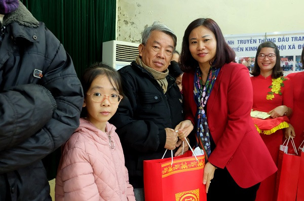 Thay mặt lãnh đạo thành phố Hà Nội, Trưởng Ban Dân vận Thành ủy Nguyễn Thị Tuyến gửi lời chúc mừng năm mới an khang, thịnh vượng tới bà con nhân dân xã Đồng Tâm, đồng thời trực tiếp trao tặng 128 suất quà Tết của thành phố đến các hộ dân.