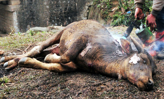 Đàn trâu đi đường, chết đến đâu xẻ thịt đến đó, thịt trâu có mùi đặc trưng, lại thâm đen do bị chết rét nên giá bán rất rẻ mạt. Một con trâu bình thường có giá đến cả 50 triệu đồng nhưng xẻ thịt bán đắt lắm cũng chỉ độ 200 ngàn/kg. Người dân mua về ăn thì ít, chủ yếu là bán cho các cơ sở chế biến thịt trâu khô thì nhiều vì giá rẻ.