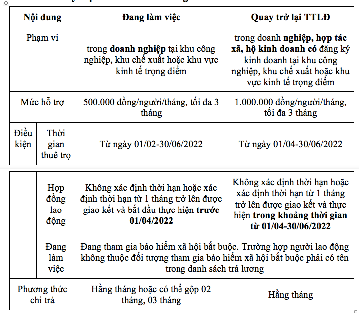 Bộ LĐ-TB&XH cho biết, theo quyết định về việc hỗ trợ tiền thuê nhà cho người lao động, có hai nhóm đối tượng được thụ hưởng là người lao động đang làm việc trong doanh nghiệp tại khu công nghiệp, khu chế xuất hoặc khu vực kinh tế trọng điểm với mức hỗ trợ 500.000 đồng/người/tháng; người lao động quay trở lại thị trường lao động, mức 1.000.000 đồng/người/tháng.