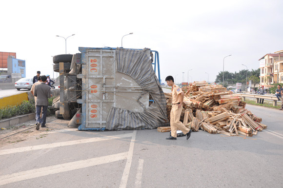 Xe tải chở gỗ bất ngờ lật nghiêng ra đường