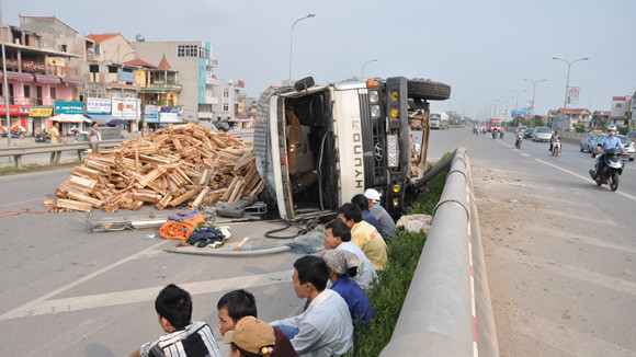 Chưa rõ nguyên nhân cụ thể, song vào thời điểm xảy ra vụ TNGT, lái xe tên Đồng (quê Thái Nguyên) đã để xe ủi tung khoảng 20m lan can ven đường, sau đó lật ngang ra đường, làm toàn bộ số gỗ chở trên thùng xe văng ra.