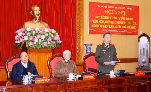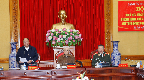 Các đồng chí Tổng Bí thư, Chủ tịch nước Nguyễn Phú Trọng; Thủ tướng Chính phủ Nguyễn Xuân Phúc; Trưởng Ban Tổ chức Trung ương Phạm Minh Chính; Bộ trưởng Tô Lâm cùng các đại biểu dự Hội nghị
