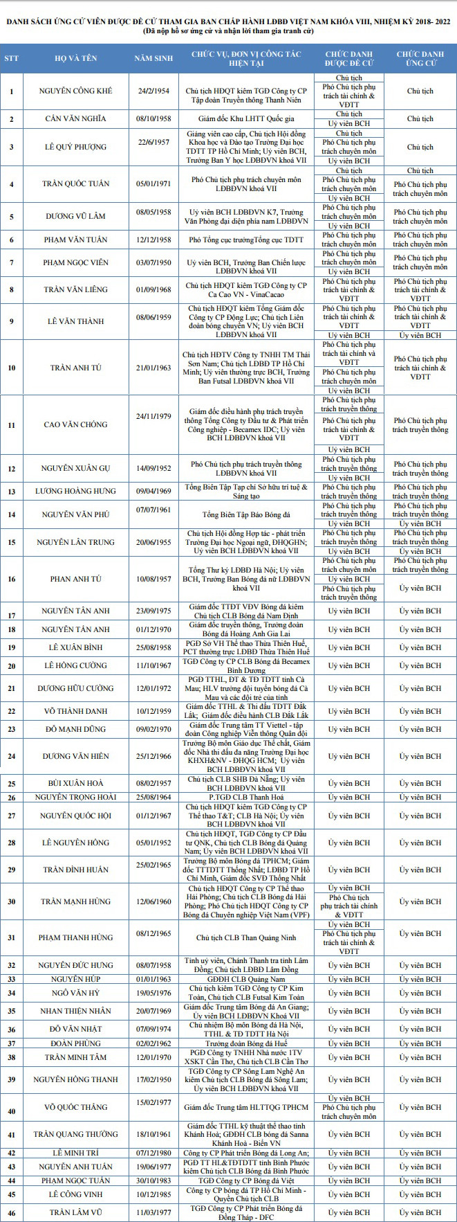Danh sách 46 ứng viên sẽ tranh cử 17 vị trí trong Ban chấp hành VFF khóa VIII
