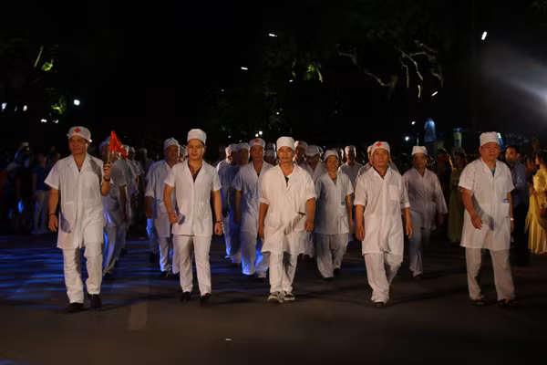 Lúc này, tại phố đi bộ Hồ Gươm đông nghịt người. Cùng với tiếng trống rộn ràng, khối tuyến đầu chống dịch Covid-19 gồm các lực lượng như quân đội, công an, đội ngũ y bác sĩ, cựu chiến binh, dân phòng… đã mở đầu màn diễu hành. Với tinh thần “chống dịch như chống giặc”, không quản ngại khó khăn, gian khổ, nguy cơ lây nhiễm, “những chiến sĩ áo trắng” cùng các lực lượng nòng cốt, xung kích trên tuyến đầu, đã góp phần vào thành công của đất nước trong cuộc chiến chống dịch Covid-19.