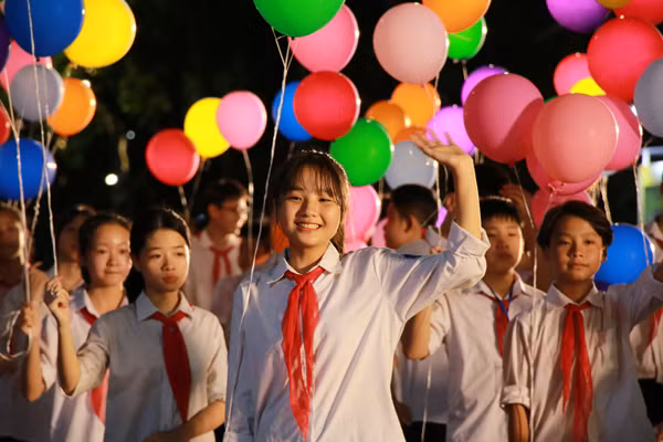Khối thanh thiếu niên diễu hành trên phố đi bộ Hồ Gươm