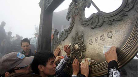 Xoa tiền vào chuông đồng, chùa Đồng để lấy may
