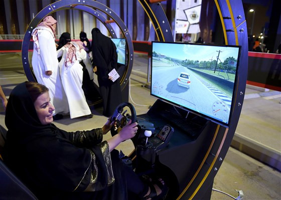 Một phụ nữ Palestine sống ở Saudi Arabia học lái xe qua mô phỏng điện tử trong một hội thảo lái xe dành cho phụ nữ ở thủ đô Riyadh 21-6-2018