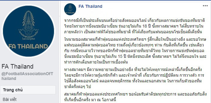 "Chúng tôi rất lấy làm tiếc và xin lỗi toàn thể cổ động viên - những người luôn sát cánh cùng bóng đá Thái Lan, đặc biệt là những ai liên quan đến sự việc", trang facebook chính thức của FAT nói về vụ HLV trưởng U18 Thái Lan lời qua tiếng lại với cổ động viên trên mạng xã hội.