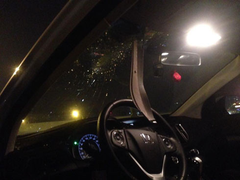 Đúng thời điểm này, xe ô tô Honda CRV mang biển kiểm soát 30E-108.88 di chuyển theo hướng ngược lại trờ tới. Cột đèn đã đổ thẳng vào ghế lái của chiếc xế hộp này, một mảnh sắt trên cột đèn đâm thủng kính trước, chỉ cách tài xế điều khiển khoảng 20cm. Rất may, tài xế xe CRV đã thoát chết trong gang tấc.