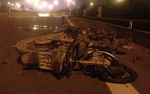 Va chạm mạnh khiến chiếc xe máy gần như nát vụn. Xe ô tô Inova bị rạn vỡ kính trước. Dọc đường có rất nhiều vết máu và mảnh vụn rải rác.