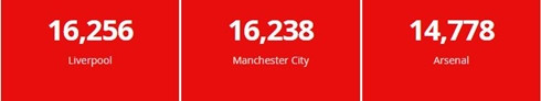 Góp mặt trong top 6 lần lượt là M.U (14.837, 84,5%), Tottenham (13.925, 82,5%) và Chelsea (14.153, 83,58%).