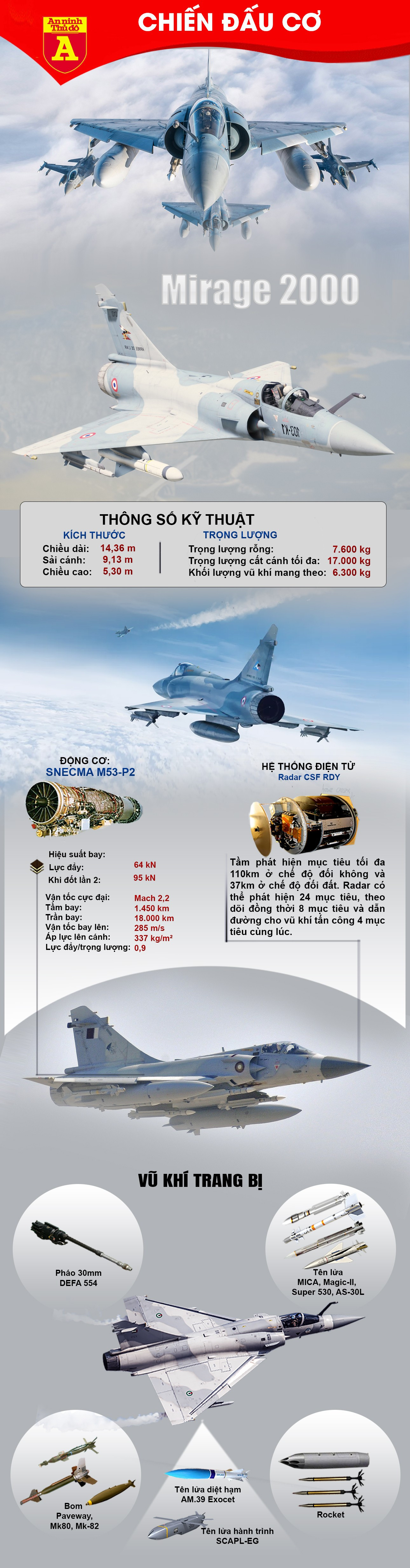 Mirage-2000 là tiêm kích phản lực thế hệ 4 một động cơ do Tập đoàn Dassault Aviation (Pháp) thiết kế và phát triển dựa trên mẫu Mirage III. Đây là loại chiến đấu cơ có cánh tam giác rất nhanh nhẹn được sản xuất và đưa vào sử dụng trong Không quân Pháp từ năm 1982. Máy bay có thể đạt tốc độ tối đa Mach 2,2; tầm hoạt động 1.550 km; khả năng chịu quá tải lên tới 11G, vượt trội con số 9G của đa số máy bay chiến đấu thế hệ 4 khác.