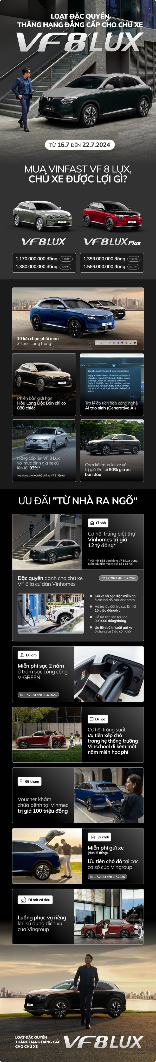ANTD.VN - Từ 16/7 – 22/7, khách hàng đặt mua dòng xe VF 8 Lux – phiên bản “thăng hạng đẳng cấp” của mẫu D-SUV điện nhà VinFast – sẽ nhận được loạt đặc quyền “khủng” chưa từng có. Nổi bật là cơ hội trúng biệt thự 12 tỷ đồng, voucher lên tới cả trăm triệu đồng, cơ hội sở hữu phiên bản giới hạn Hỏa Long Độc Bản… cùng hàng loạt ưu đãi trên mọi hành trình “từ nhà ra ngõ”.