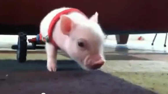Xem video chú lợn di chuyển trên 2 chân và hai bánh xe...