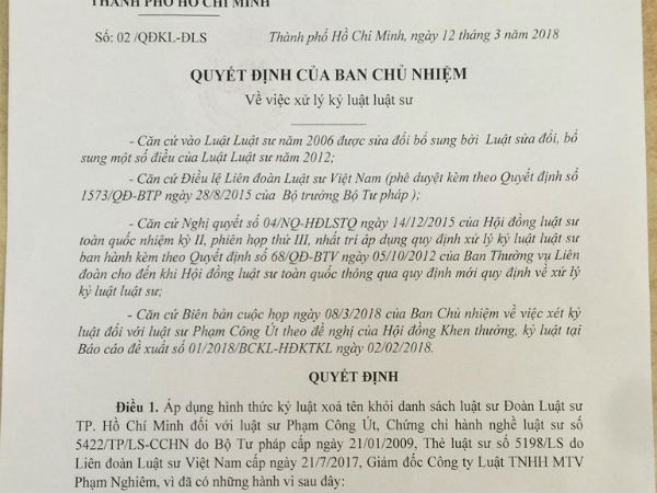 Quyết định của Đoàn Luật sư TP.HCM về việc kỷ luật, xóa tên luật sư Phạm Công Út