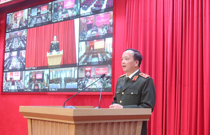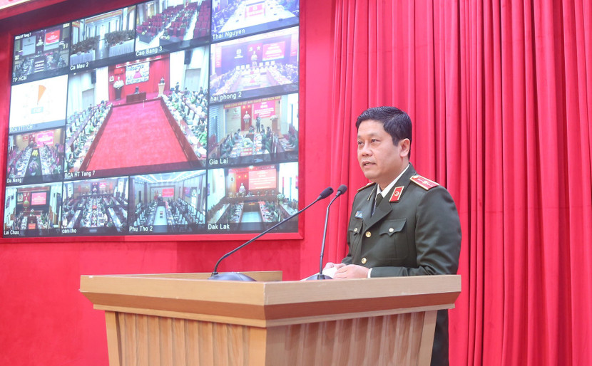 Thiếu tướng Nguyễn Hồng Nguyên, Phó Chánh Văn phòng Bộ Công an, Phó Trưởng Ban Thường trực Ban Chỉ huy Phòng thủ dân sự Bộ Công an trình bày Báo cáo tại Hội nghị.