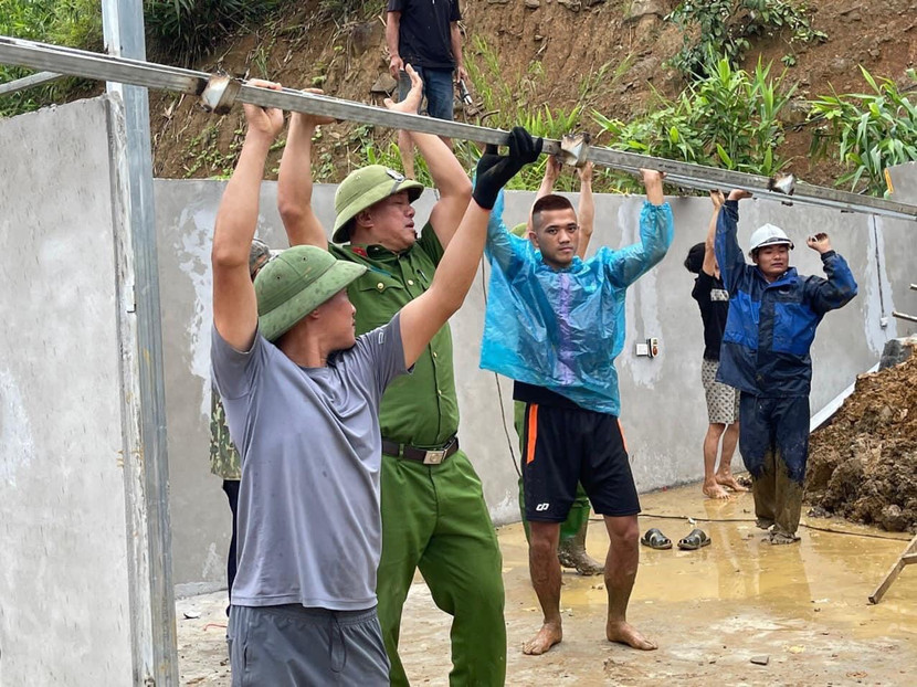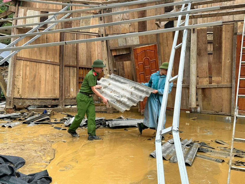 | Công an xã Xuân Tầm, huyện Văn Yên, tỉnh Yên Bái, hỗ trợ người dân khắc phục hậu quả mưa lũ. |
