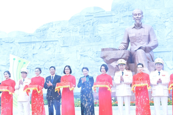 Chủ tịch Quốc hội Nguyễn Thị Kim Ngân và Bộ trưởng Bộ Công an Tô Lâm cùng các đồng chí lãnh đạo các cấp cắt băng khánh thành khu lưu niệm Sáu điều Bác Hồ dạy CAND