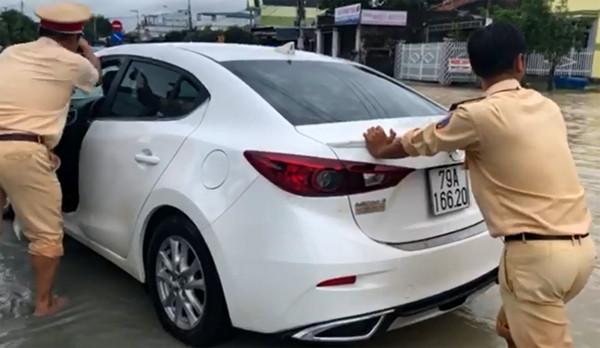 Do mưa lũ tràn ngập qua đường QL1A ở phường Cam Nghĩa và xã Cam Thịnh Đông, TP Cam Ranh nên từ sáng sớm ngày 25-11, CBCS Đội TT - KS giao thông Cam Ranh, thuộc Phòng CSGT Công an tỉnh Khánh Hòa luôn có mặt trên đường, hướng dẫn hàng trăm lượt xe ô tô vượt qua những đoạn ngập lụt, trong đó có không ít trường hợp xe ô tô chết máy đã được CSGT đẩy bộ ra khỏi hiện trường để tránh ùn tắc giao thông.