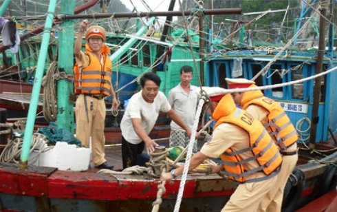 Phương tiện thủy của người dân được các chiến sỹ Công an hướng dẫn, cùng chằng buộc để đối phó với cơn bão số 9