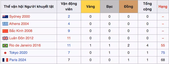Thể thao Việt Nam tham dự Paralympic từ năm 2000, đến nay đã có tổng cộng 51 lượt VĐV tham gia tranh tài, giành tổng cộng 6 huy chương (tính tới ngày 5-9-2024), bao gồm 1 huy chương vàng, 2 huy chương bạc và 3 huy chương đồng.