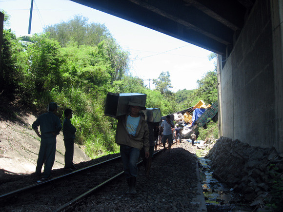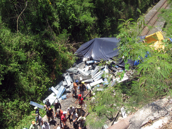 Đây cũng là Km 1306+200 đường sắt Bắc - Nam, đoạn thuộc hầm phía Bắc đèo Rù Rì. Phần đuôi chiếc xe tải này cùng nhiều hàng hóa trên xe là các thùng tôn và khoai sọ đổ xuống làm chắn ngang đường sắt Bắc - Nam. Theo anh Nguyễn Văn Tuyền - Nhân viên tuần hầm Công ty đường sắt Phú Khánh thì, trong lúc anh đang làm nhiệm vụ tại khu vực phía Bắc hầm Rù Rì thì đột nhiên thấy chiếc xe tải 29M-4109 lao xuống đường tàu cùng nhiều hàng hóa gây cản trở đường sắt nghiêm trọng. Ngay lập tức, anh Tuyền thông báo nhân viên tuần hầm Rù Rì phía Nam để cùng đặt pháo phòng vệ, đứng canh tàu không tàu đi qua cung đường này, đồng thời cấp báo hai ga gần nhất là Nha Trang và Lương Sơn để có biện pháp giải quyết.