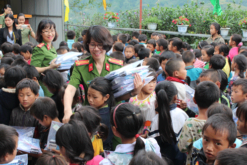 Trung tá Nguyễn Thị Duyên trong một lần tham gia hoạt động xã hội từ thiện tại trường Tiểu học San Sả Hồ 2, huyện Sa Pa, tỉnh Lào Cai