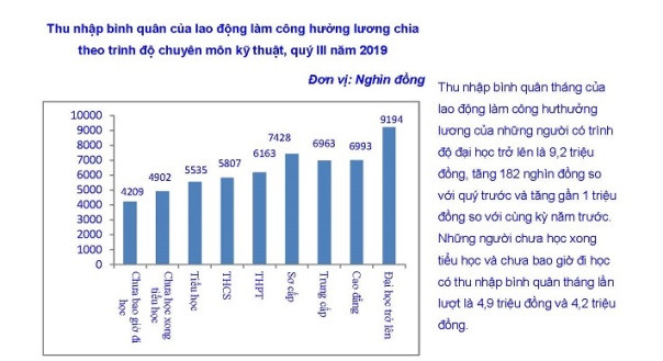 Thu nhập bình quân tháng của lao động làm công hưởng lương của những người có trình độ đại học trở lên là 9,2 triệu đồng, tăng 182 nghìn đồng so với quý trước và tăng gần 1 triệu đồng so với cùng kỳ năm trước. Tuy vậy, những người chưa học xong tiểu học và chưa bao giờ đi học có thu nhập bình quân tháng lần lượt là 4,9 triệu đồng và 4,2 triệu đồng/tháng.