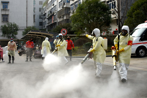 Tình nguyện viên trong trang phục bảo vệ thực hiện khử trùng một khu dân cư ở Chiết Giang (Trung Quốc) hôm 30-1