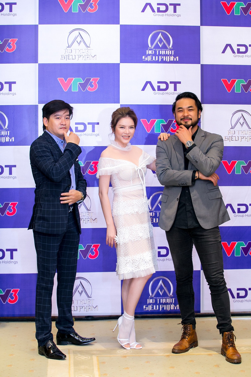 Lý Nhã Kỳ và hai vị giám khảo đồng hành cùng mình trong gameshow "Ảo thuật siêu phàm" - ảo thuật gia Palmas Nguyên (trái) và ảo thuật gia Petey Majik (phải)