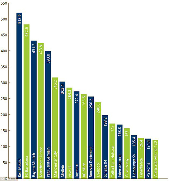 Còn nhớ, M.U từng có giai đoạn thống trị trên bảng xếp hạng của Tập đoàn tư vấn tài chính Deloitte với 8 năm liên tiếp dẫn đầu, trước khi để Real Madrid vượt mặt năm 2005. Theo bảng xếp hạng những đội bóng kiếm nhiều tiền nhất thế giới vừa được Deloitte công bố, tổng thu nhập của M.U trong năm vừa qua kém CLB dẫn đầu Real Madrid tới hơn 80 triệu bảng, và kém đội xếp thứ hai Barcelona 50 triệu bảng.