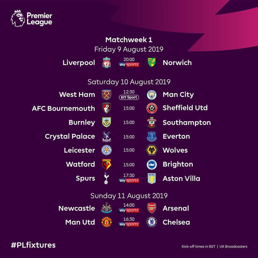 Lịch thi đấu vòng 1 Premier League 2019/19