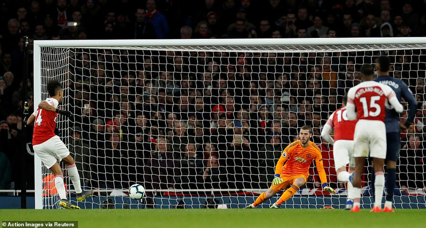 Trên chấm 11m, Aubameyang lạnh lùng nhân đôi cách biệt. Ở tình huống này, De Gea lại phán đoán sai hướng sút của tiền đạo đối phương.