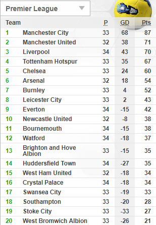 Bảng xếp hạng Ngoại hạng Anh sau vòng 34