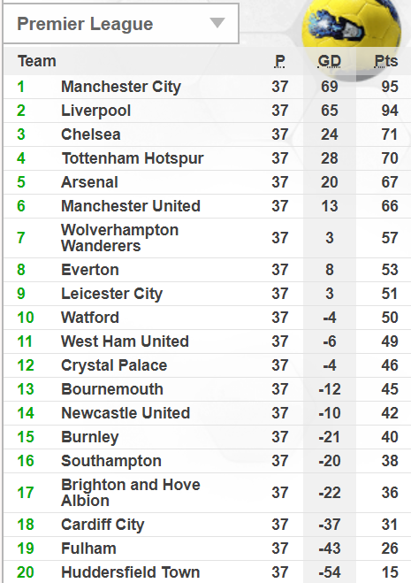 Bảng xếp hạng giải Ngoại hạng Anh sau vòng 37