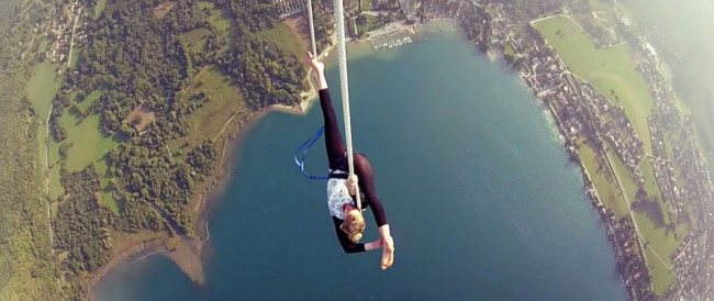 Nghệ sỹ múa Roxane đã “bay lên trời cao” trên một sợi dây thừng dài 3,5m, mà không đội mũ bảo hiểm hay bất cứ một thiết bị an toàn nào tương tự, để hoàn thành màn xiếc nguy hiểm của mình cùng với phi công Gill Schneider.