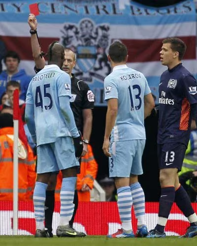 Trong trận đấu với Arsenal, Balotelli chỉ lĩnh thẻ đỏ gián tiếp sau cú vào bóng quyết liệt quá mức cần thiết với Bakary Sagna ở phút 90. Nhưng trước đó, trong hiệp một, tiền đạo người Italy còn có một tình huống phạm lỗi đáng lĩnh thẻ đỏ trực tiếp khác với Alex Song, nhưng may mắn vẫn ở lại trên sân do các trọng tài không kịp quan sát.